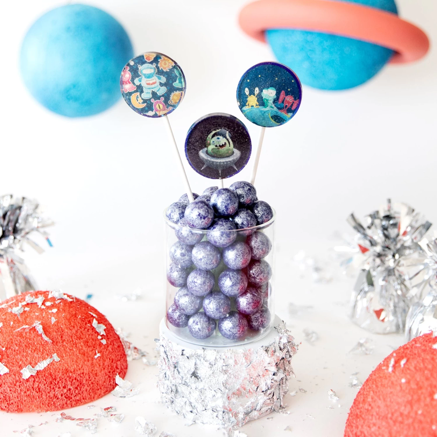 Take a trip through the cosmos with our Galaxy Malt Balls, a delicious and visually stunning milk chocolate candy that has a crunchy malt ball center. These deep purple and silver malt balls are an awesome choice for any outer space party!