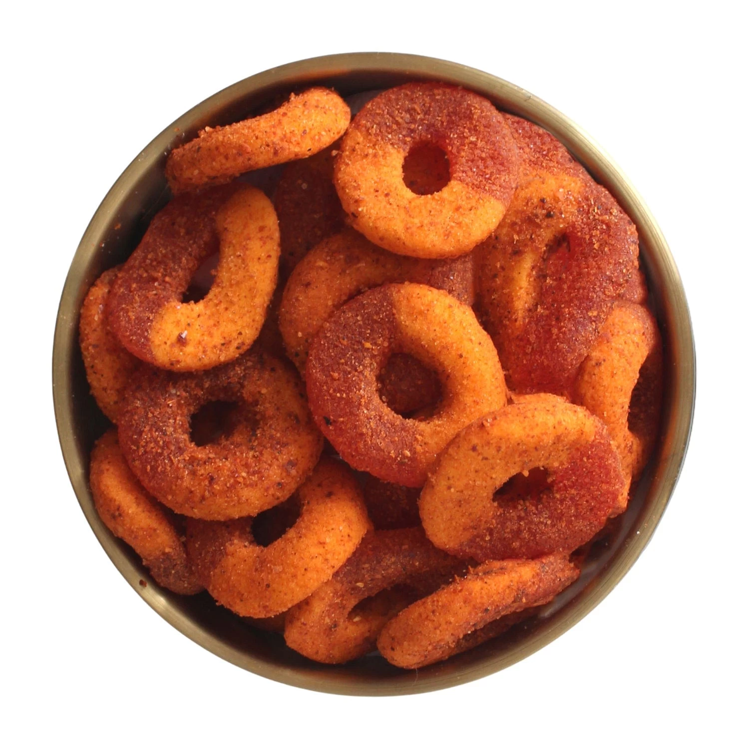 Fruity, gummy peach rings coated in spicy chamoy are the perfect combination of a sweet and salty treat.