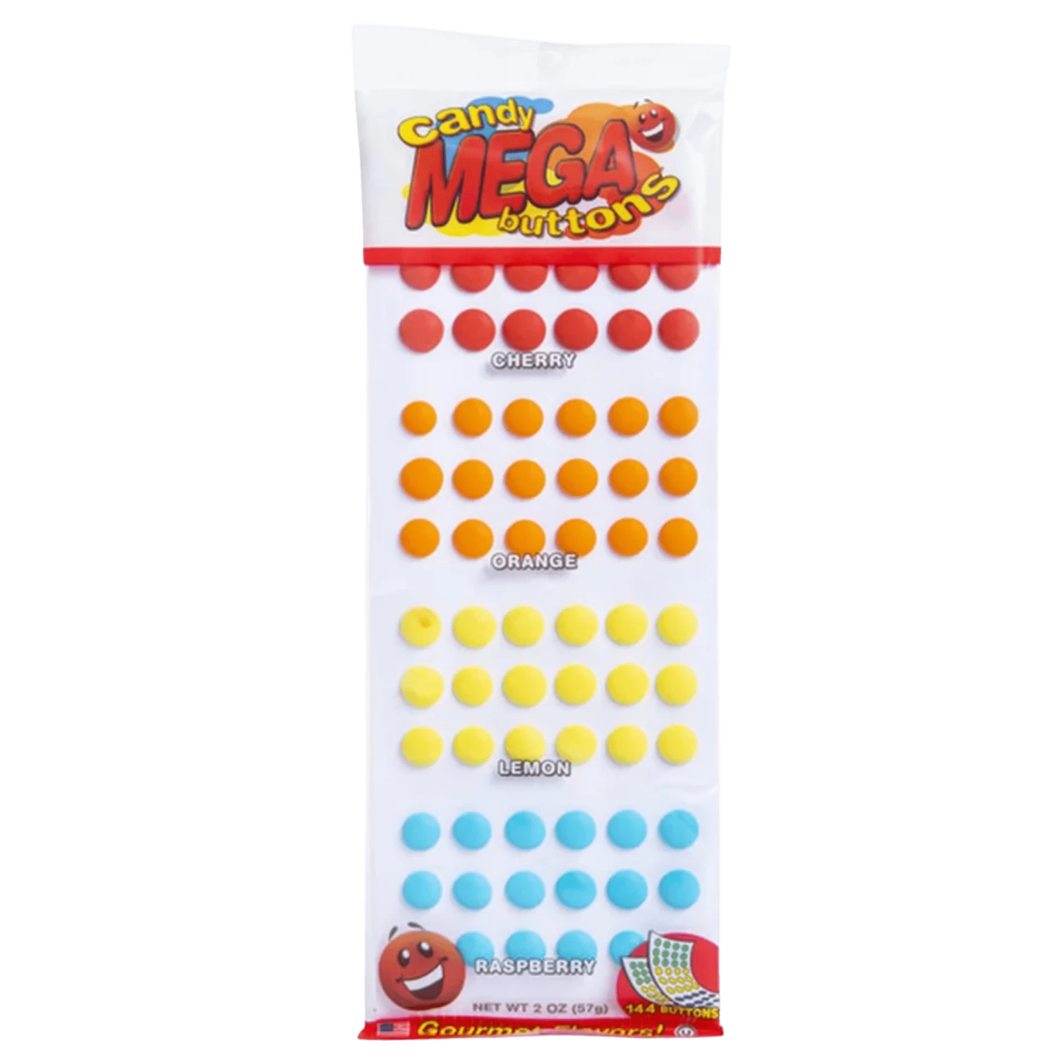 A favorite old-fashioned candy favorite is back and bigger than ever, with Mega Candy Buttons. Sweet candy buttons are attached to the traditional paper backing with 2 sheets (144 buttons) per package, and come in 4 colorful flavors: cherry (red), orange (orange), lemon (yellow), and raspberry (blue).