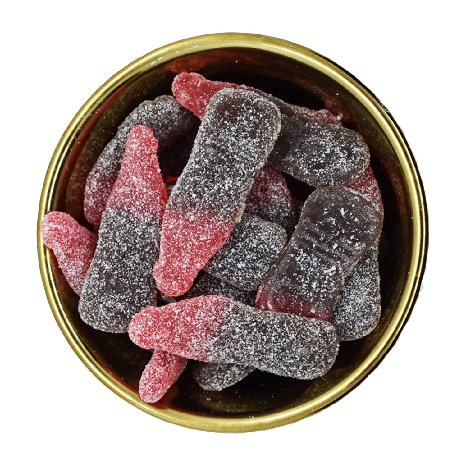 Gummy cherry cola bottles boast a flavor as big as real cherry cola. Dusted with sugar, two-toned sweet and sour gummy candy is a great flavor party for your taste buds.