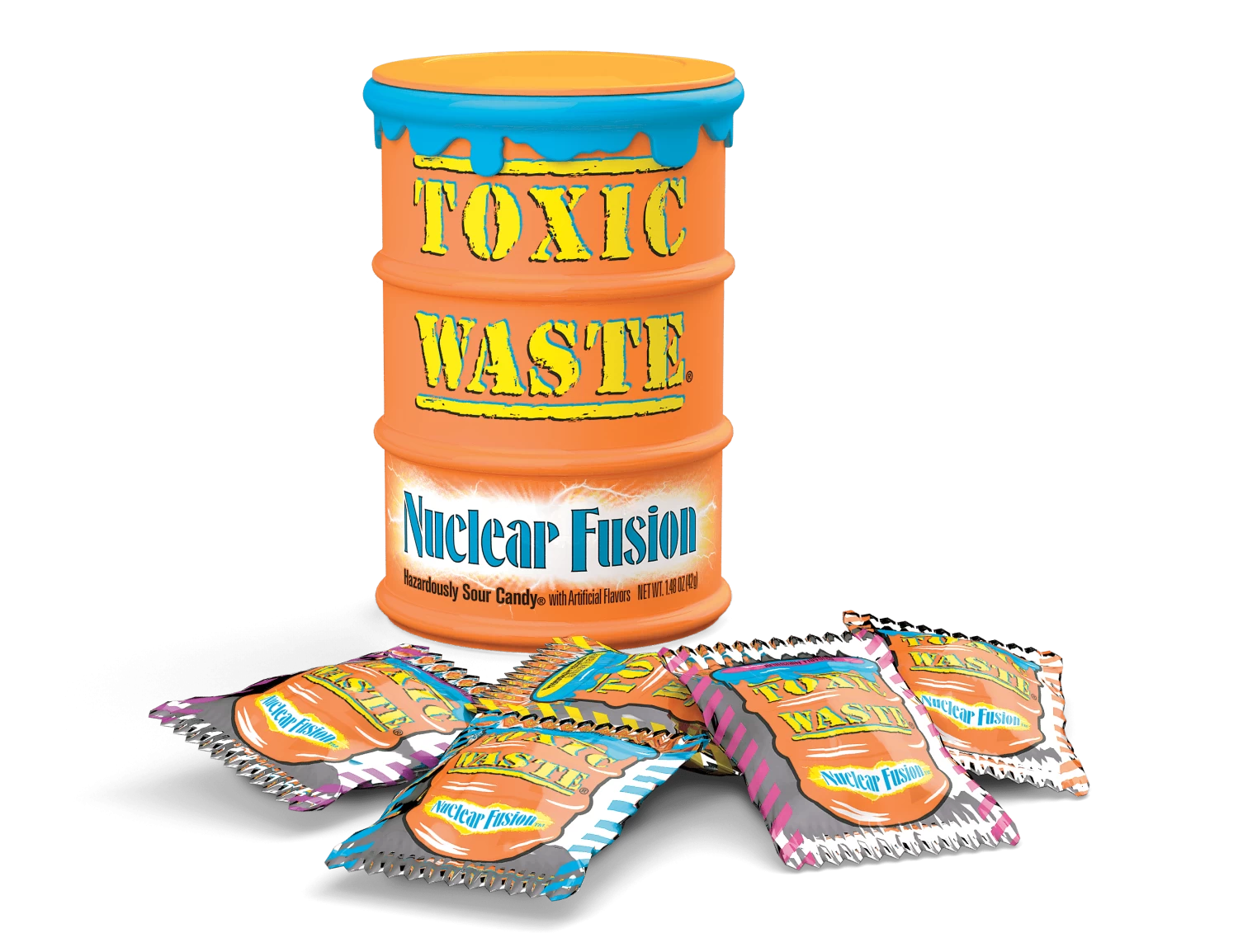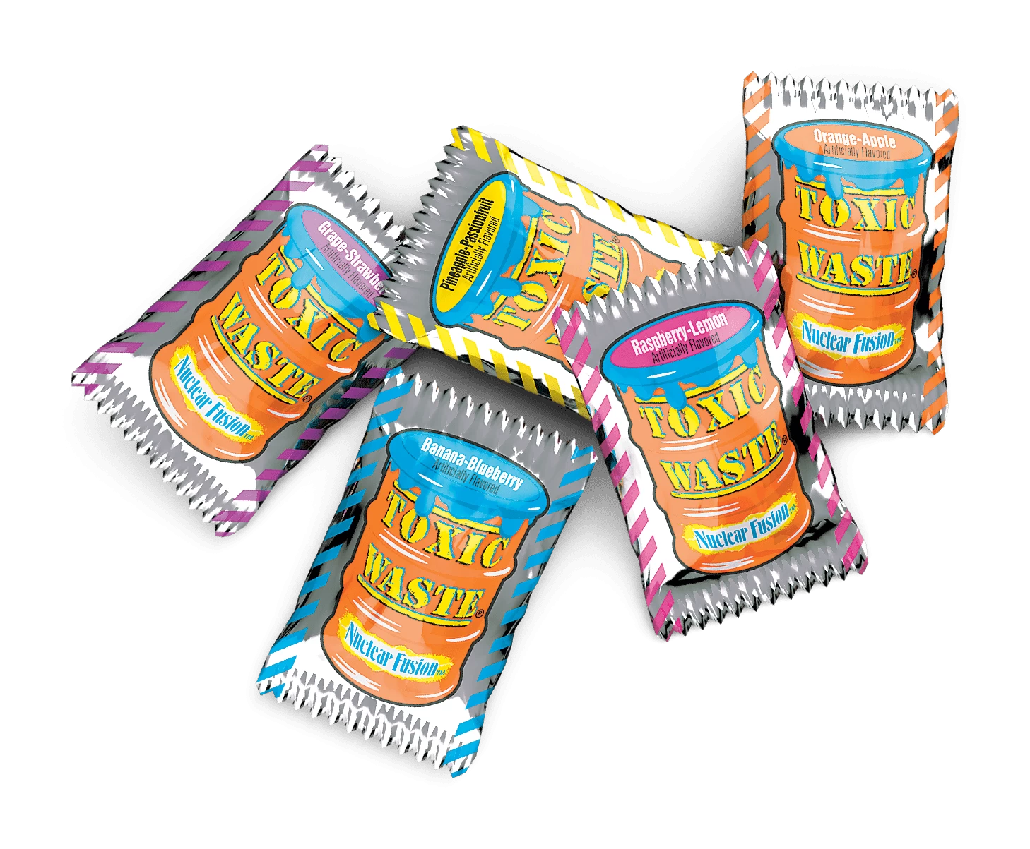Cringe and smile all at once at the extremely sour taste of Toxic Waste® Nuclear Fusion™ candy. Each pack delivers a combination of two fruity flavors in every mouth-puckering candy.